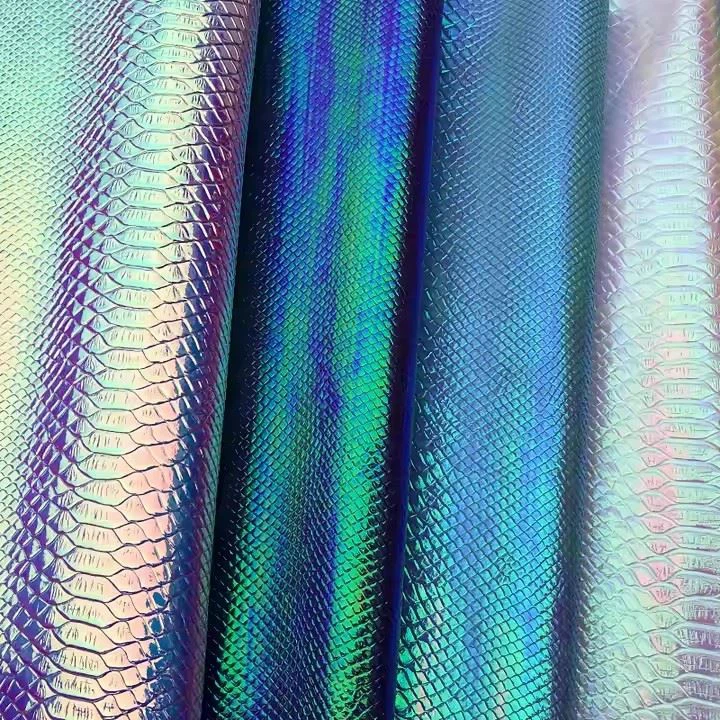 - Klasická dúhová fóliová reliéfna pu -faux vinylová hadí kožená látka je luxusný a štýlový materiál, ktorý je ideálny na vytváranie módnych kabeliek. Vďaka svojmu krásnemu dizajnu dúhovej fólie tejto látky dodáva do každého príslušenstva nádych elegancie a sofistikovanosti.